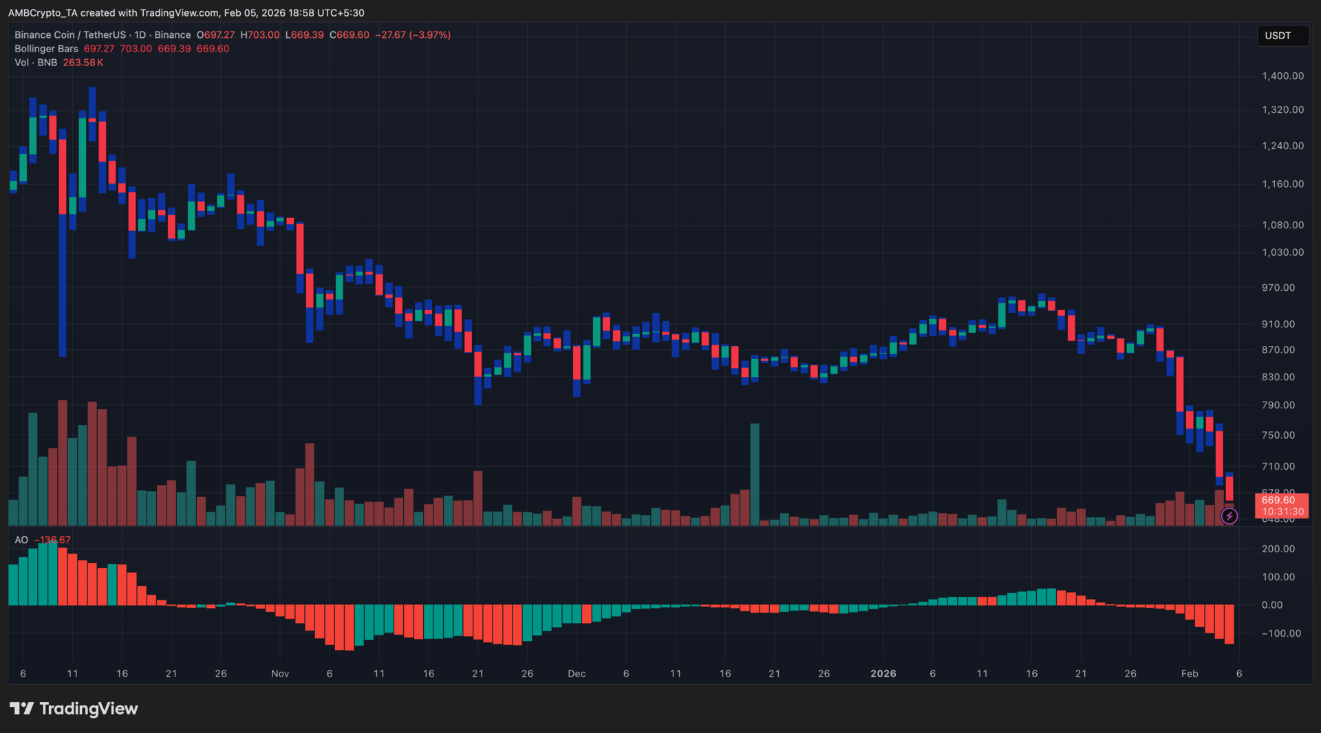 BNB slid to $669 after a sharp sell-off, extending its recent downside move as selling pressure accelerated across the broader market.