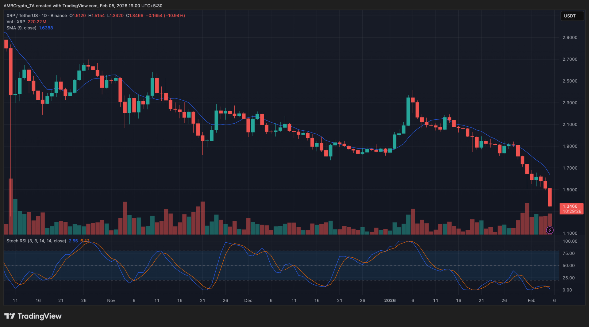At press time, XRP was trading at $1.34, marking a sharp double-digit decline over the last 24 hours.