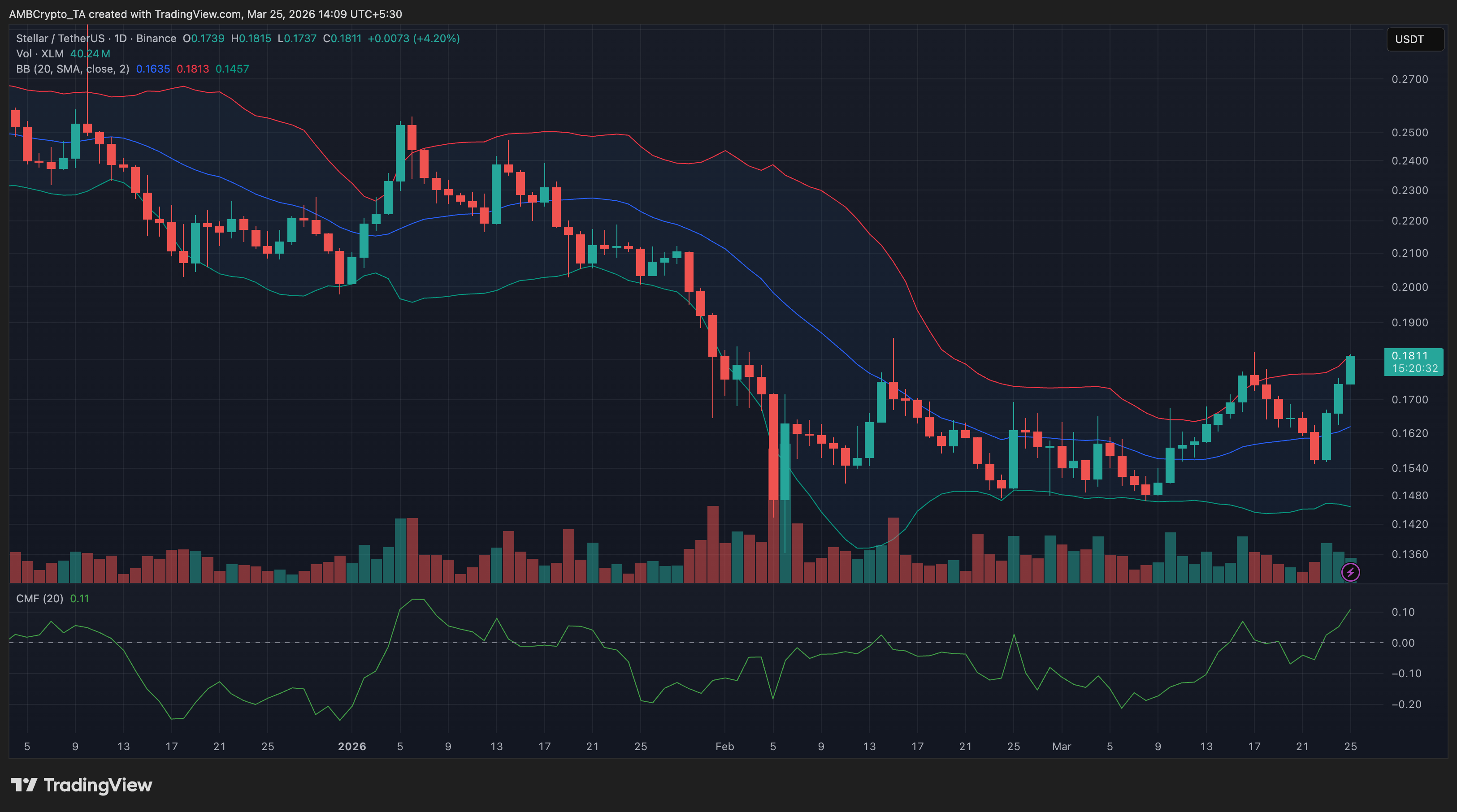 XLM gained traction after stabilizing near $0.15 earlier in March, gradually forming higher lows before testing resistance in the $0.18 to $0.19 region. The move coincided with Bollinger Bands widening after a period of compression, indicating a fresh volatility expansion. Sustained strength above $0.19 could support a continuation toward the $0.21 zone, while failure to hold momentum may bring the $0.16 support area back into focus.