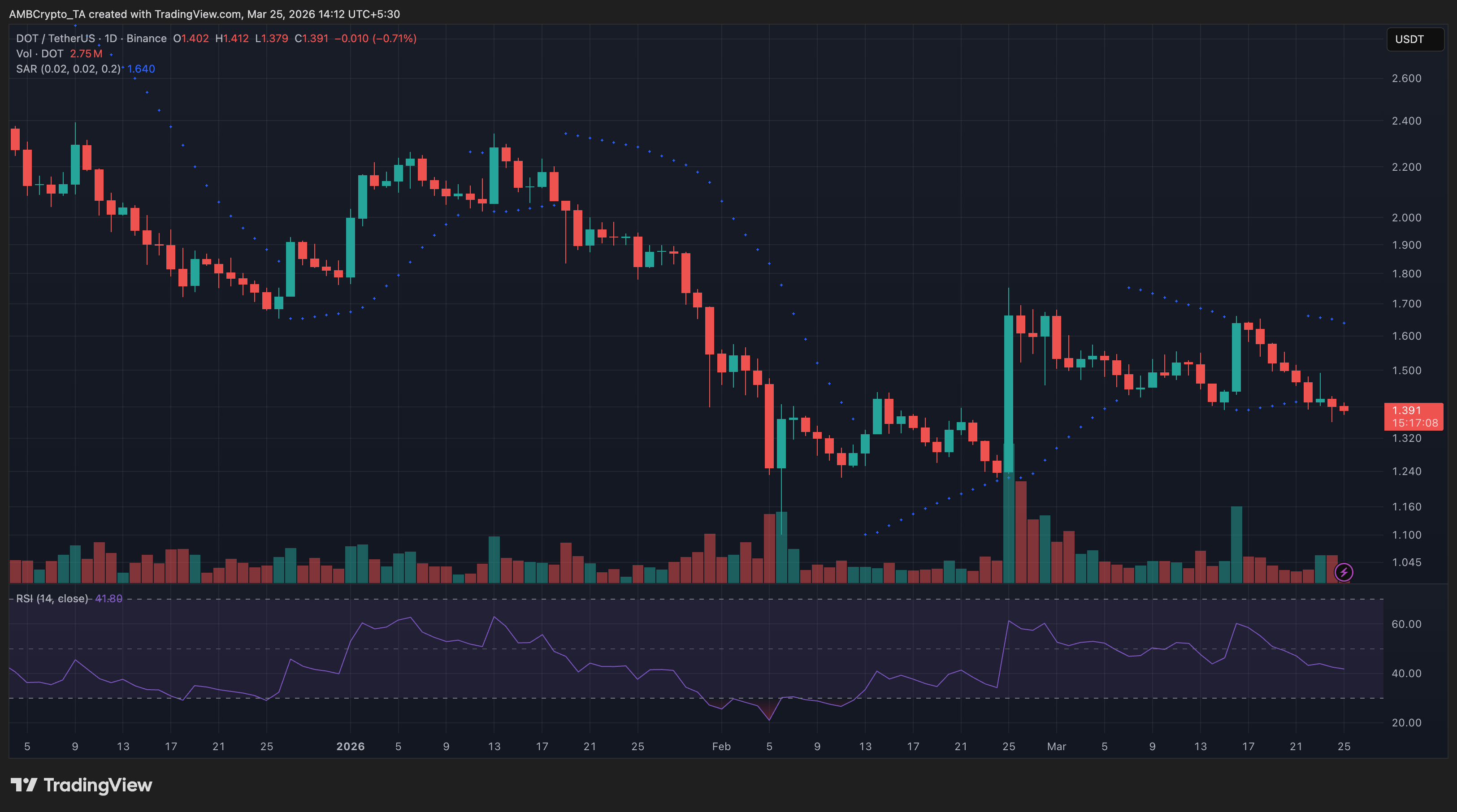 DOT slipped toward $1.39 after failing to sustain its late-February breakout, while Parabolic SAR stayed above price and signaled persistent selling pressure.