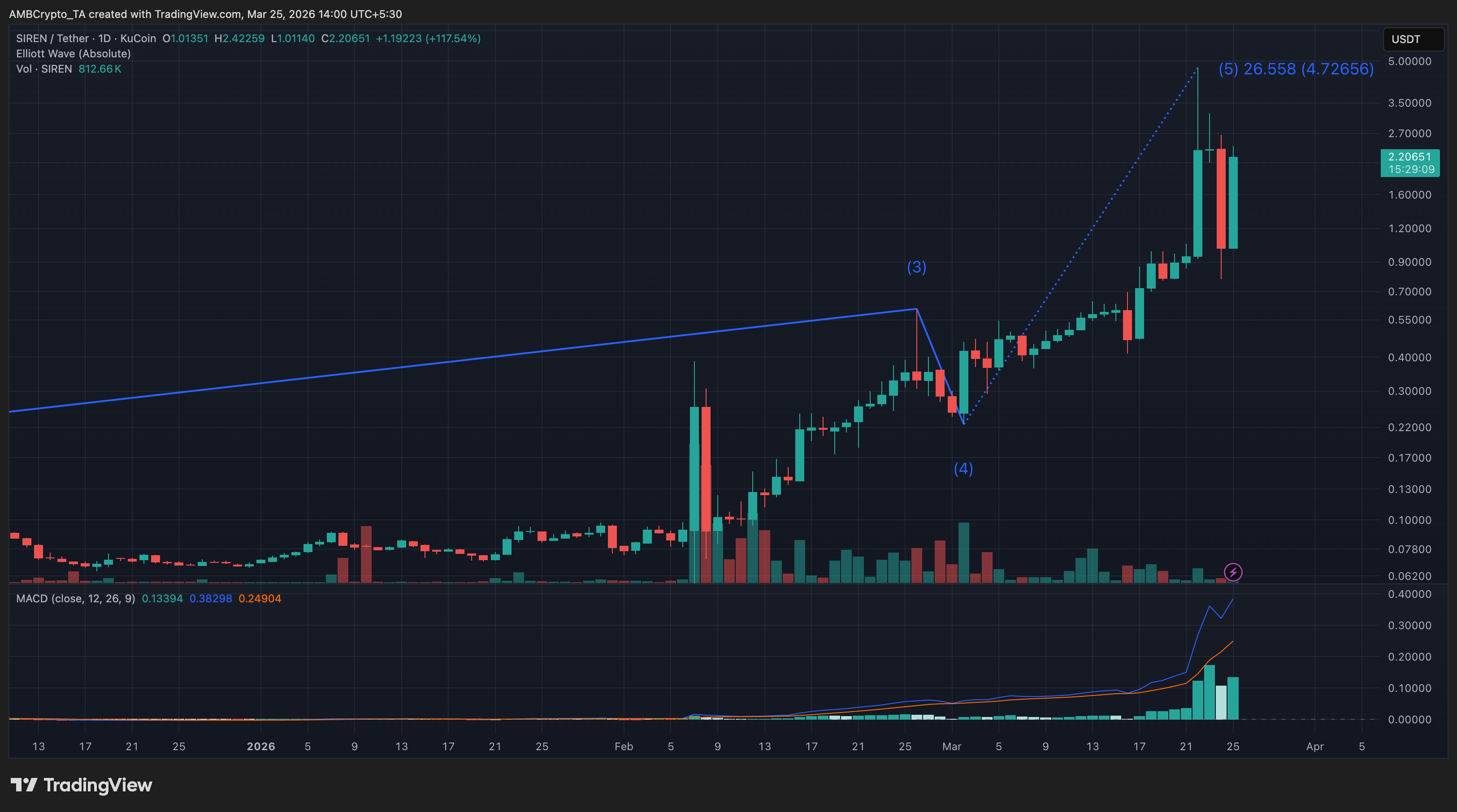 SIREN accelerated into a steep uptrend after forming higher lows through March, eventually completing a strong fifth-wave advance that briefly sent the token toward the $2.40 area before a pullback. Price later stabilized near the $2.00 region, which now acts as an immediate support level to watch. Sustained closes above $2.40 could keep upside momentum intact, while a drop below $2.00 may expose the token to sharper retracements toward the $1.60 zone.