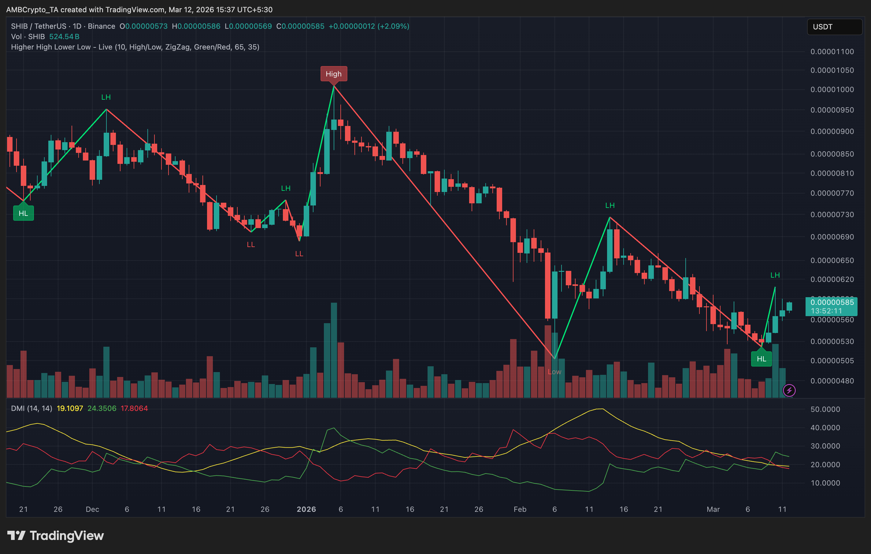 SHIB traded near $0.00000585 at press time after posting a modest daily gain, reflecting a mild recovery from its recent downtrend.
