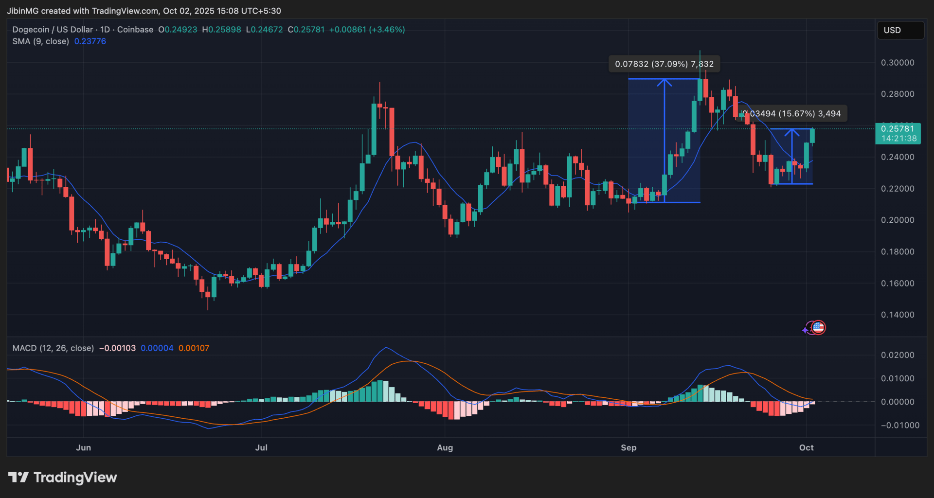 Days after a significant fall, DOGE’s price appreciated by over 15% in less than a week.
