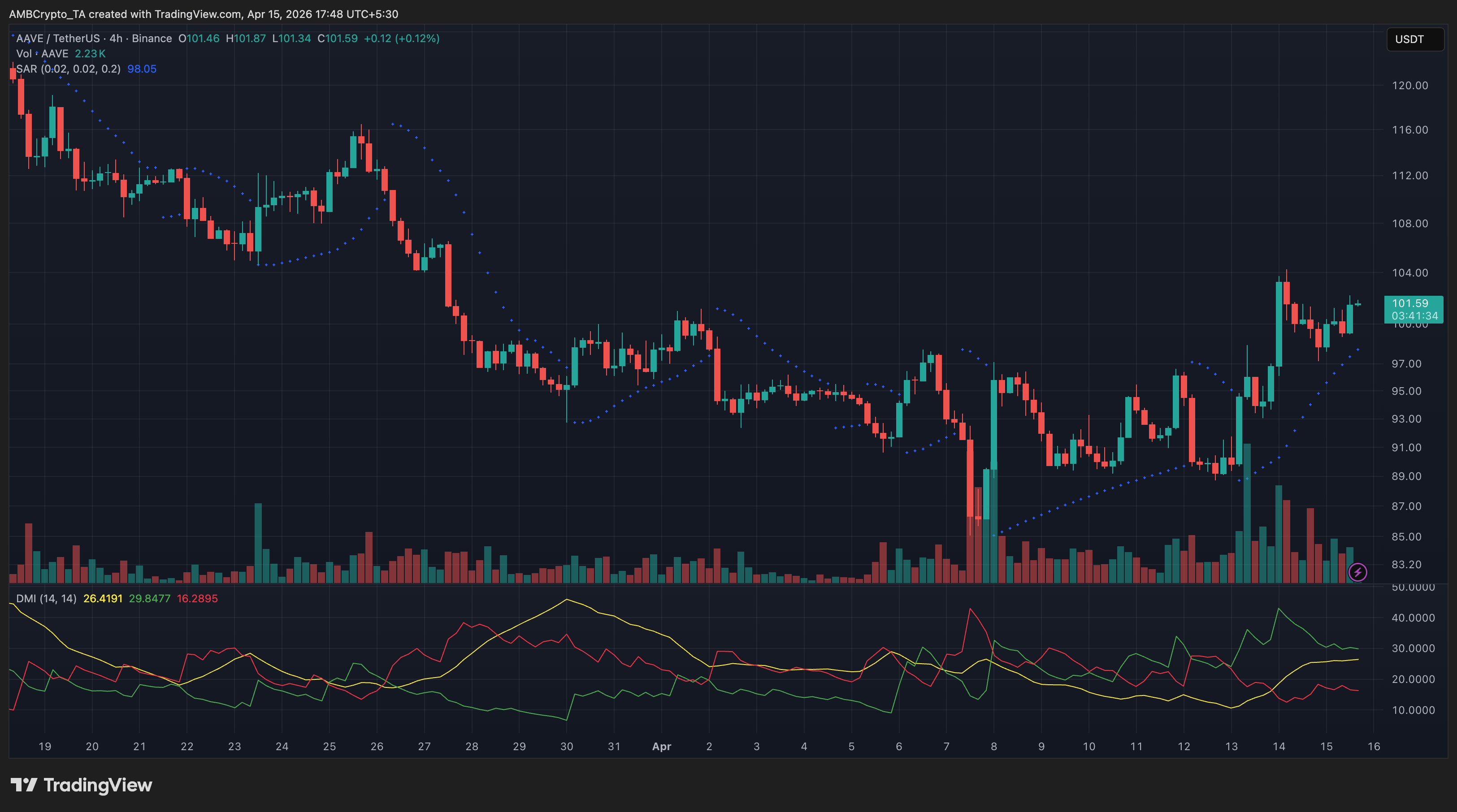 After climbing from the mid-$90s, AAVE settled near the $100–$102 range, with recent candles showing reduced follow-through. The Parabolic SAR moved beneath price, indicating a shift in direction, but the lack of strong separation suggested the trend was still developing. DMI showed +DI ahead of -DI, supported by a moderate ADX reading, pointing to a recovery that had yet to fully strengthen. Volume declined after the initial push, aligning with the current pause in momentum. The move followed the April 13 approval of Aave’s revenue-focused governance proposal and Fireblocks introducing institutional access to its lending markets. Support is at $100, while $103 acts as near-term resistance.