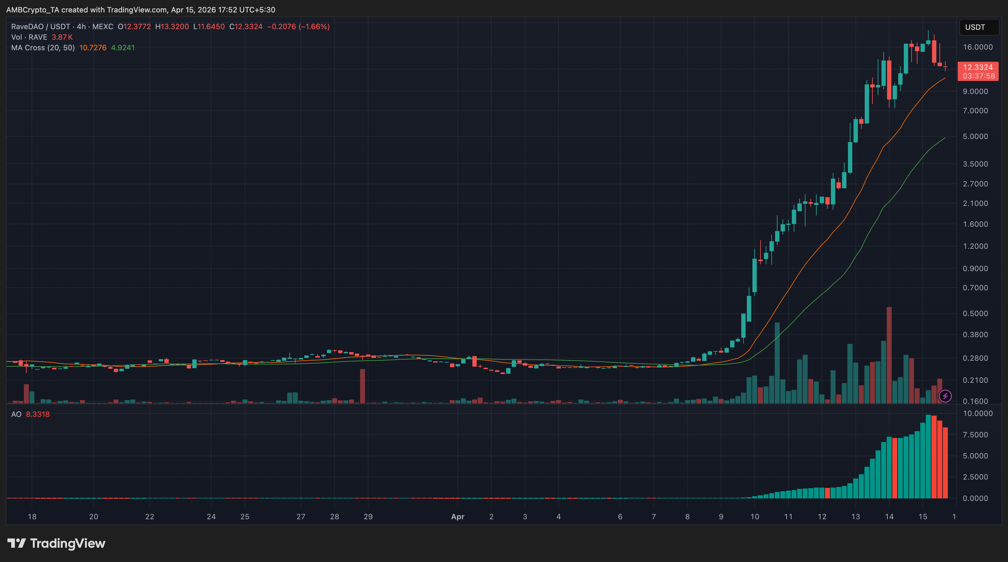 RAVE dropped toward $12.33 after peaking near $16, with price pulling back toward the 20 MA despite a still-bullish MA structure.