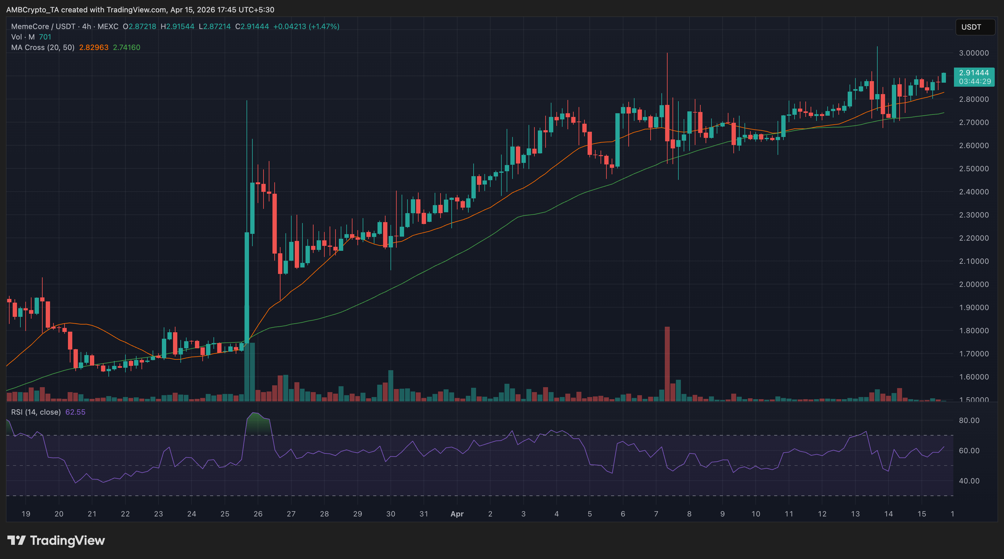 M hovered near $2.91 after a steady climb, with the 20/50 MA structure staying firmly bullish.