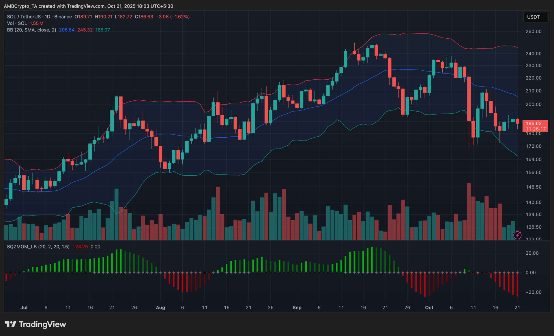 SOL was last seen trading at $186, recording a 1.6% daily loss as bearish pressure persisted following Bitcoin’s market-wide pullback.