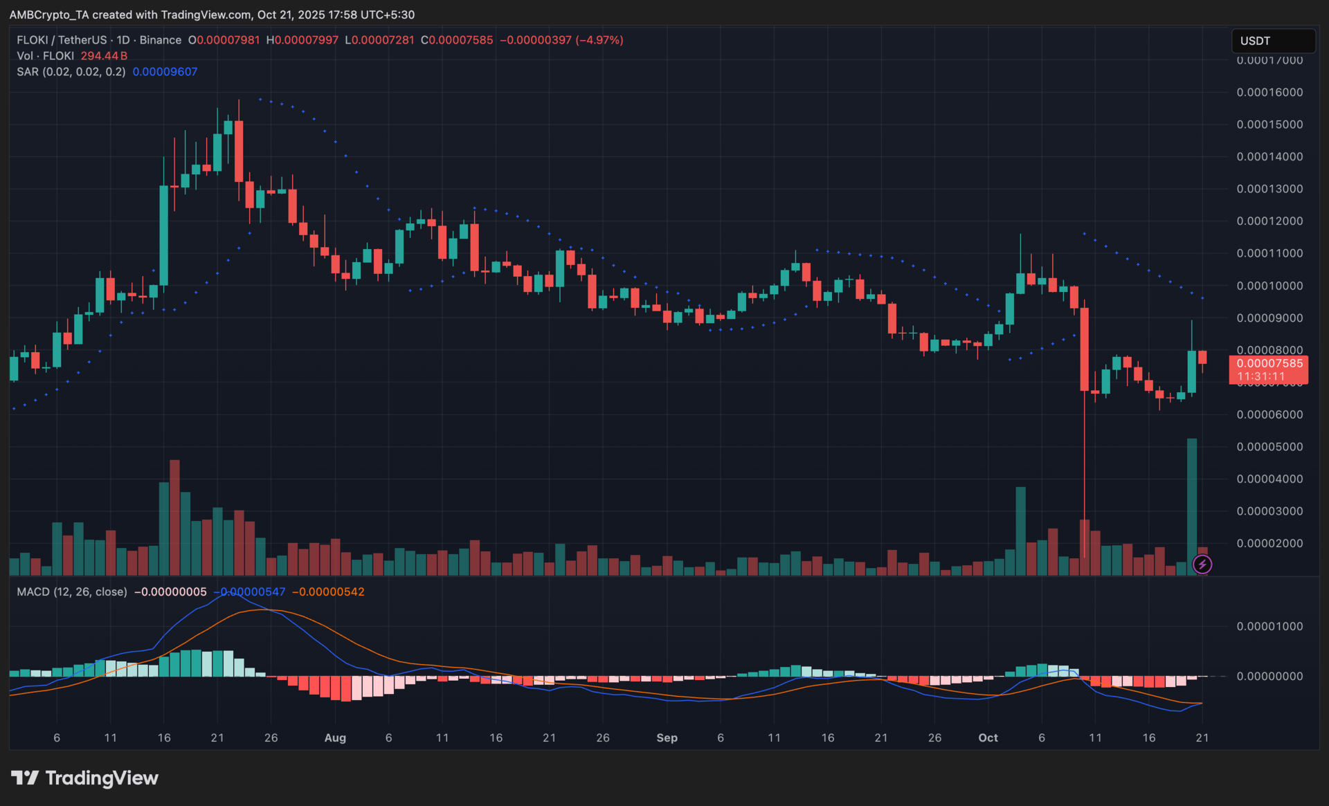 The Parabolic SAR remained above the candles, confirming a bearish setup, while the MACD histogram hovered near neutral, showing fading momentum after heightened volatility.