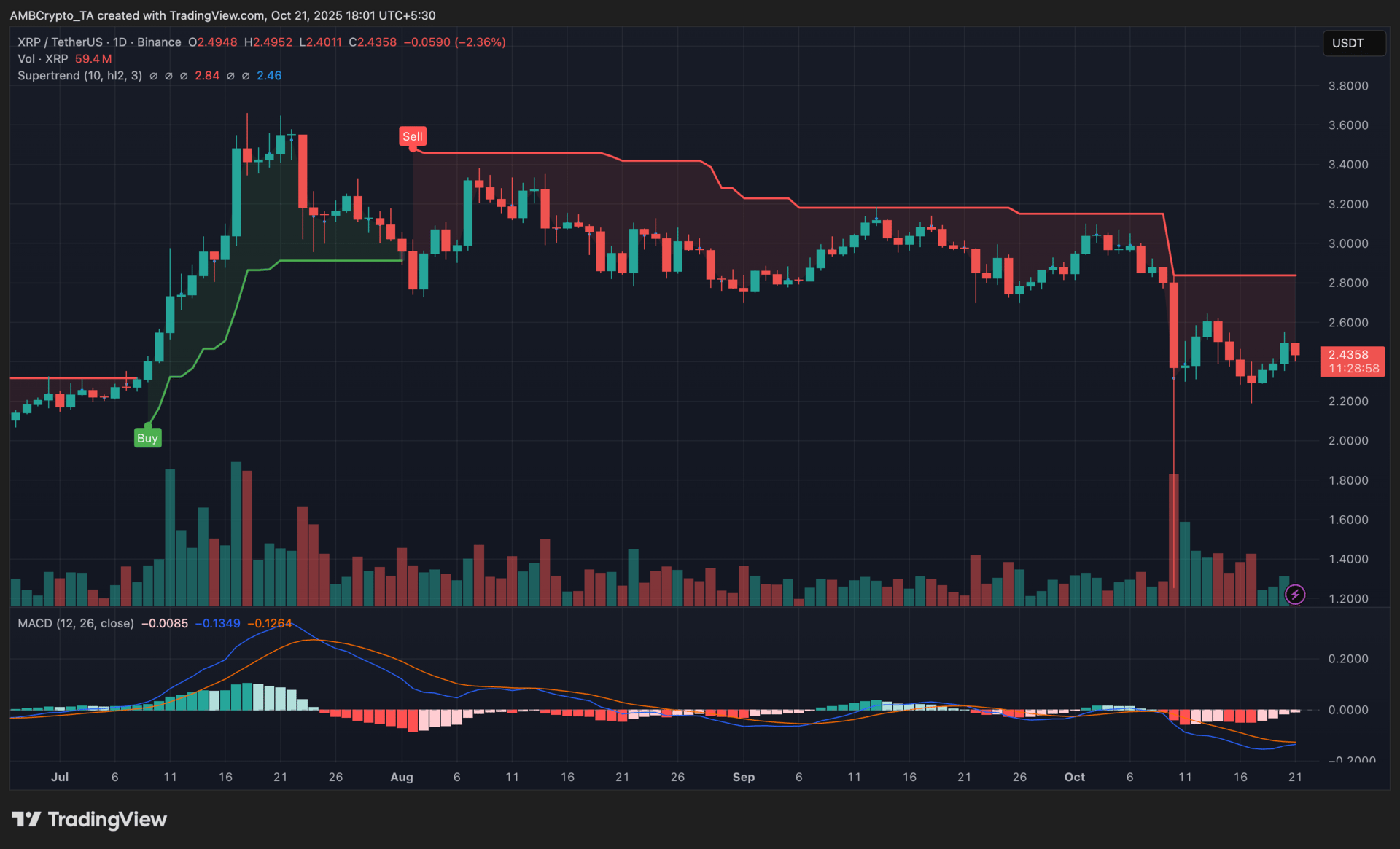The Supertrend remained in a Sell phase since late July, while the MACD histogram stayed slightly negative, hinting at persistent bearish pressure despite narrowing momentum.