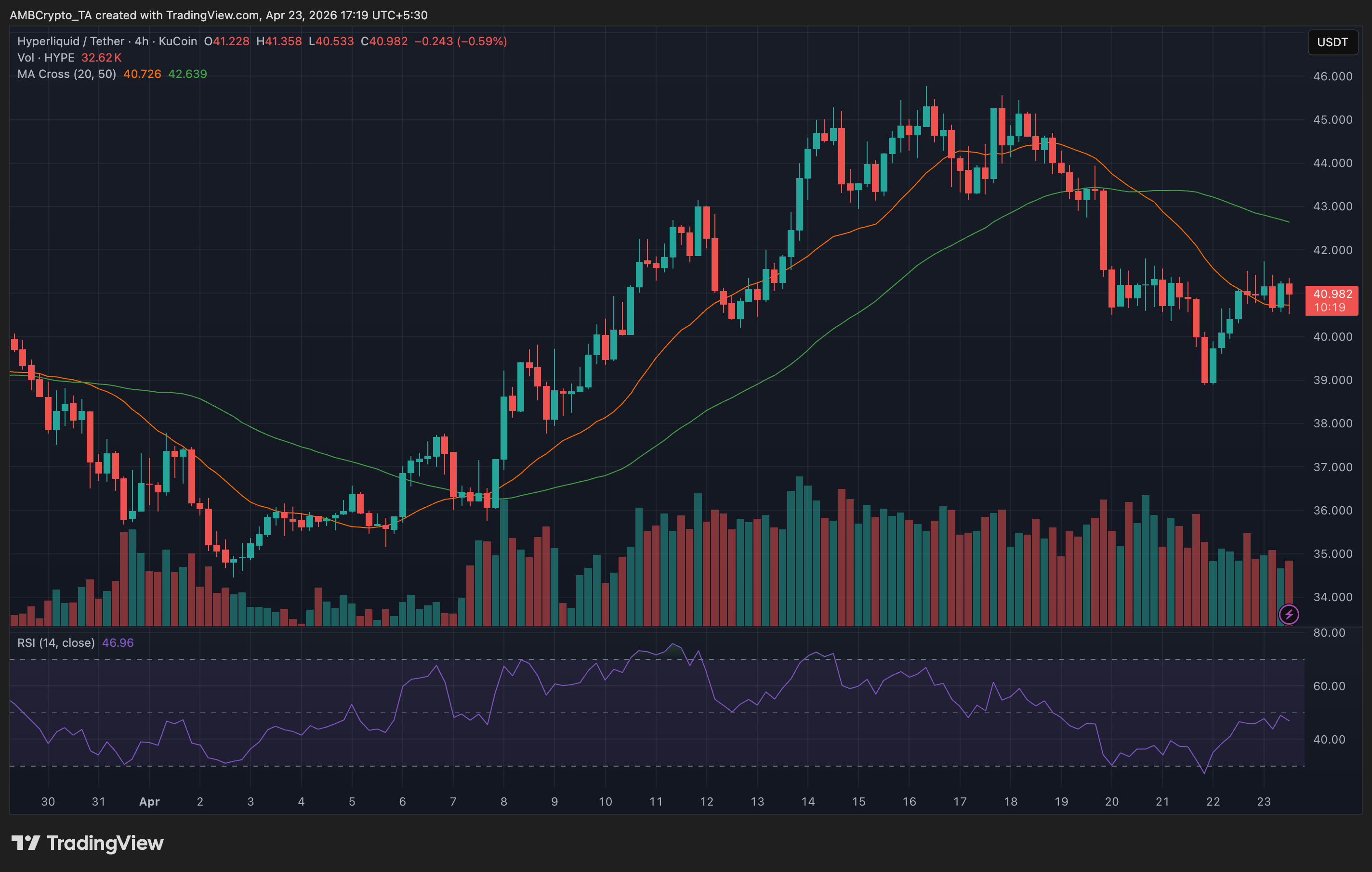 HYPE stabilized near $40.98 after reclaiming the 20 MA at $40.73, while the 50 MA at $42.64 remained the next resistance barrier to watch.