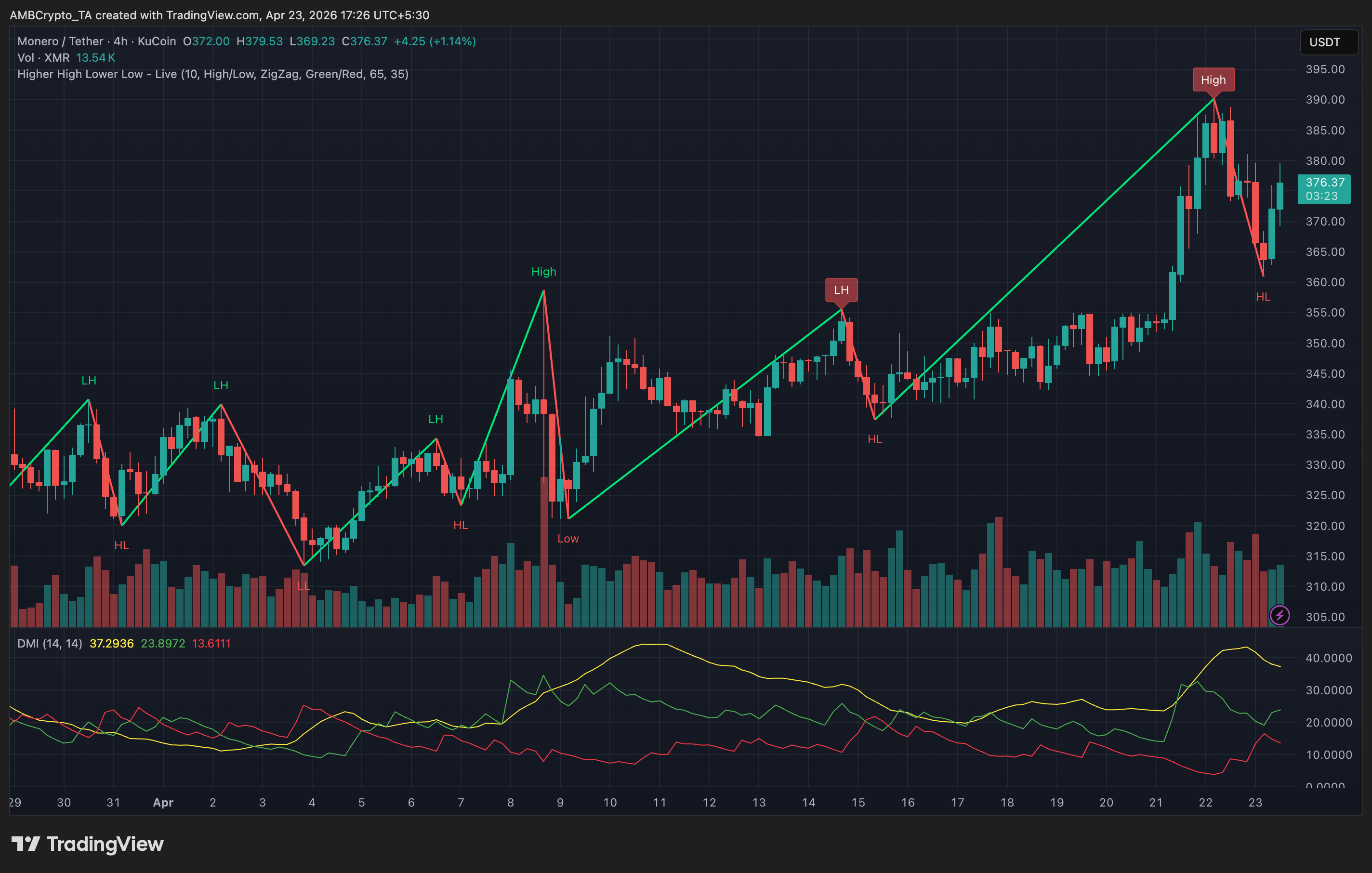 At the time of writing, XMR traded at $376 after rebounding from the $362 higher-low zone, while a push toward $390 kept the broader uptrend intact.
