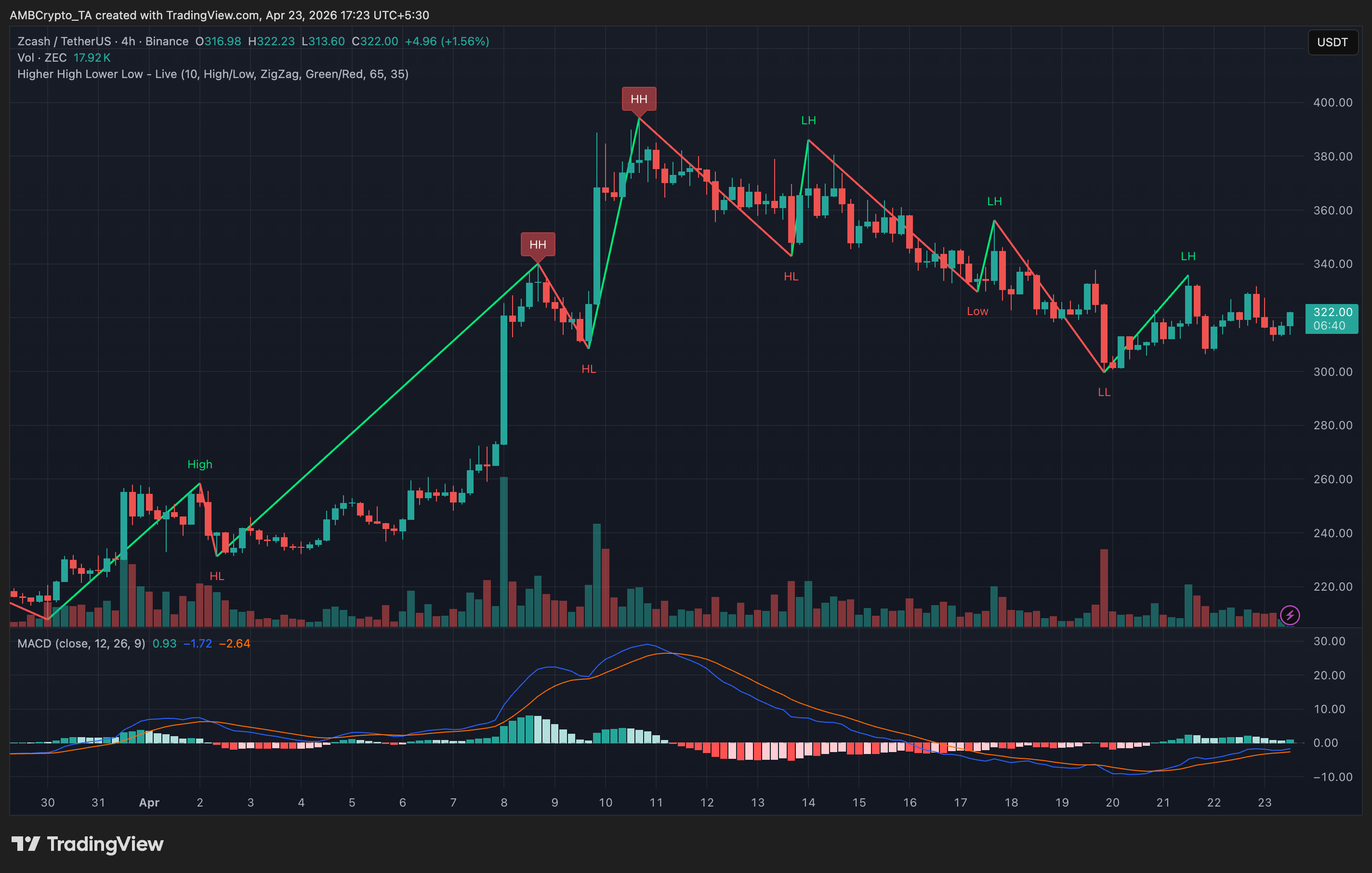 ZEC stabilized above the $300 zone and pushed back toward the $330 resistance area, though a lower-high structure suggested broader upside continuation was still being tested.