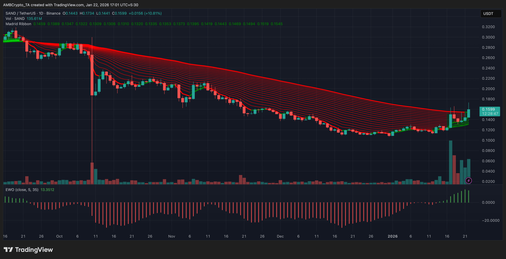 Trading volume expanded significantly compared to prior sessions, suggesting the move was supported by real demand rather than thin liquidity. This increase in activity coincided with improving sentiment across the altcoin market, where capital rotation away from majors appeared to favor higher beta tokens like SAND.