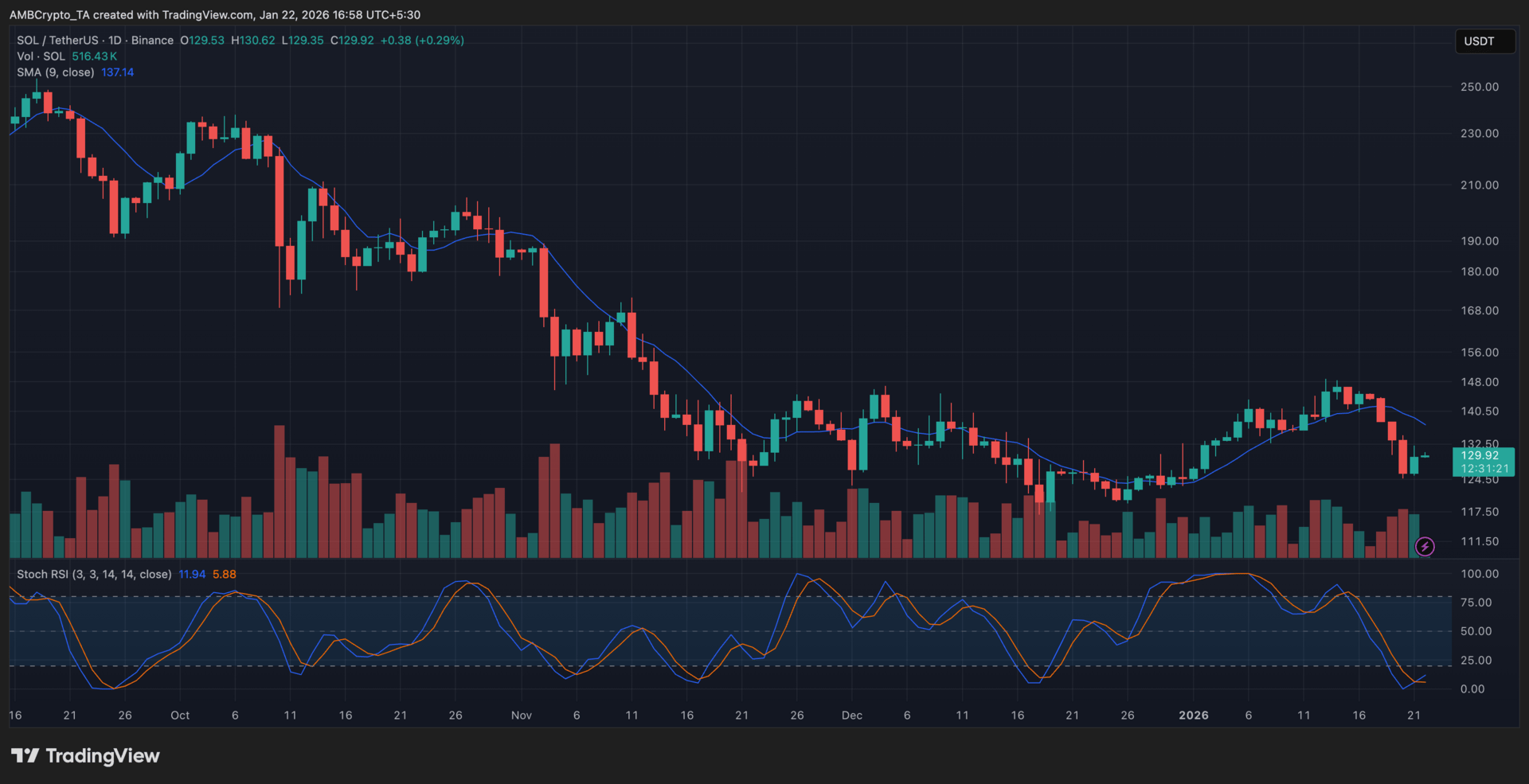 Solana attempted a mild rebound after steep weekly losses, with price stabilizing in the low-$130 region. Despite the bounce, SOL mostly traded below its 9-day SMA, which continued to cap upside moves and reflect short-term weakness. Repeated rejections near this level highlighted cautious buyer behavior.