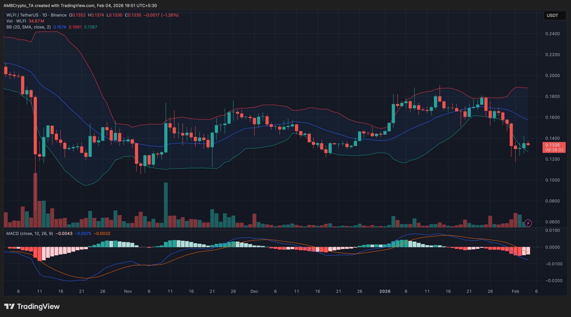 WLFI hovered near $0.133 after drifting toward the lower Bollinger Band, highlighting sustained selling pressure rather than a momentum reset.