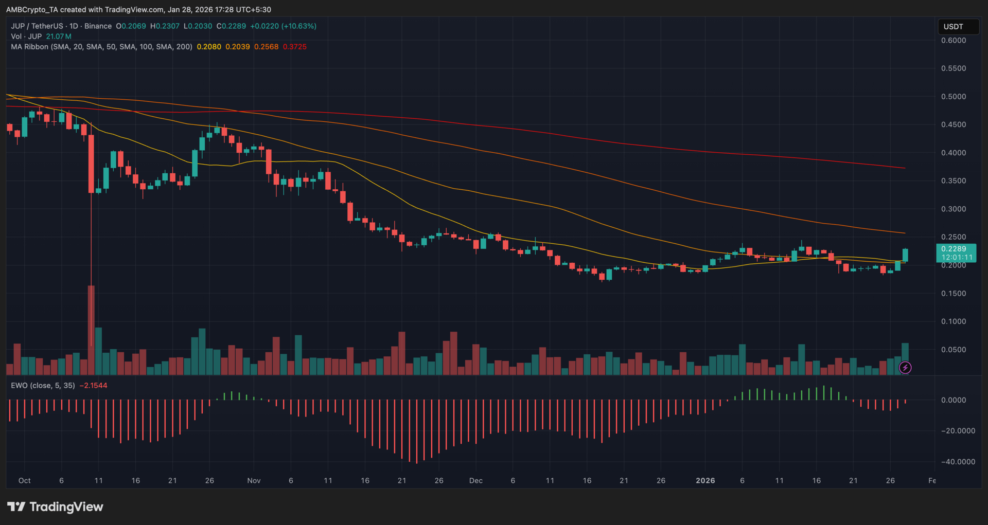 At the time of writing, JUP was trading at $0.22 after rising over 10% on the daily chart, snapping a multi-week consolidation phase.