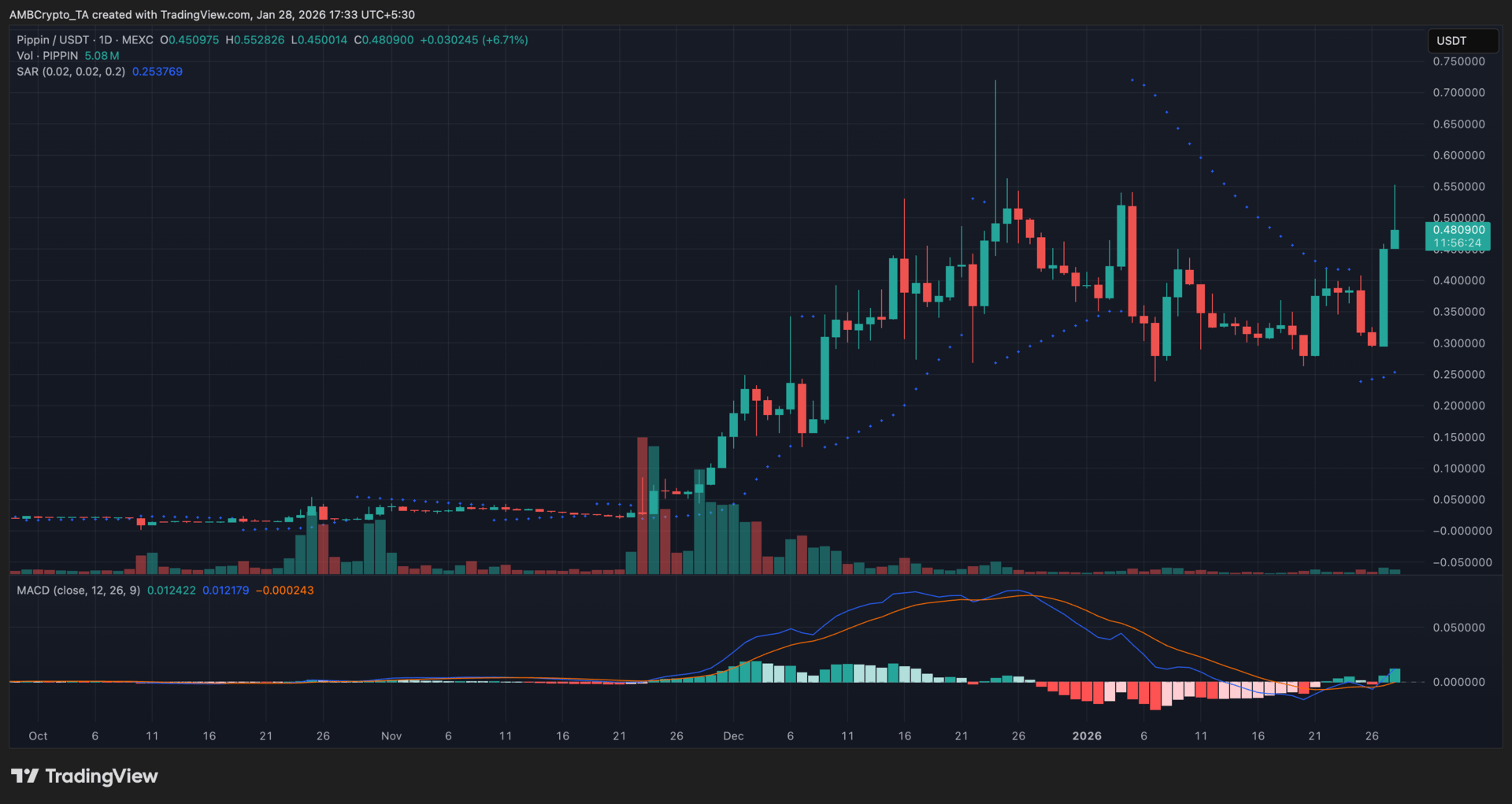PIPPIN rebounded after defending the $0.32 region, with price pushing back toward the $0.48 level as buying momentum returned. The Parabolic SAR shifted beneath the candles, signaling a short-term trend change, while the MACD lines crossed upward and the histogram moved into positive territory, reflecting improving momentum.