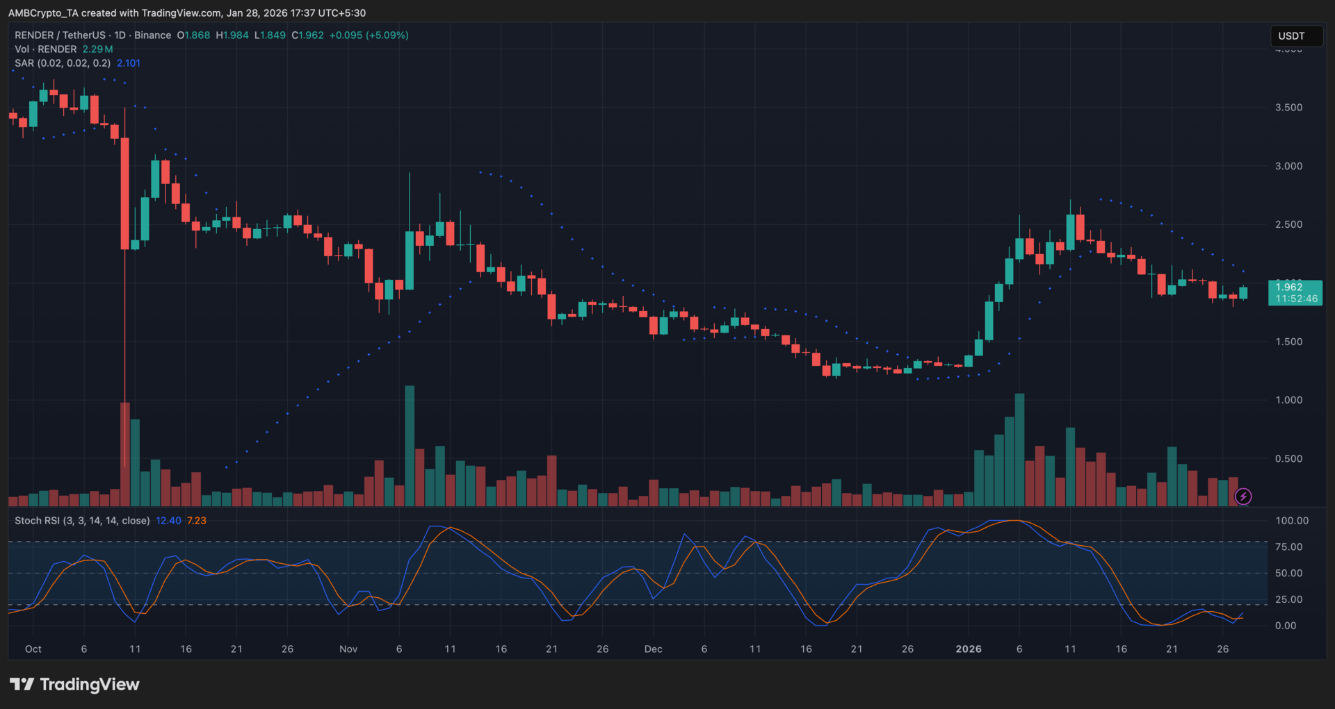 RENDER’s latest move looked more like stabilization than acceleration. Price found footing around the $1.85–$1.90 region, where selling pressure began to thin and volume showed early signs of participation. Still, the broader structure remained cautious, as the Parabolic SAR continued to trail above price, signaling that sellers retained control of the prevailing trend.