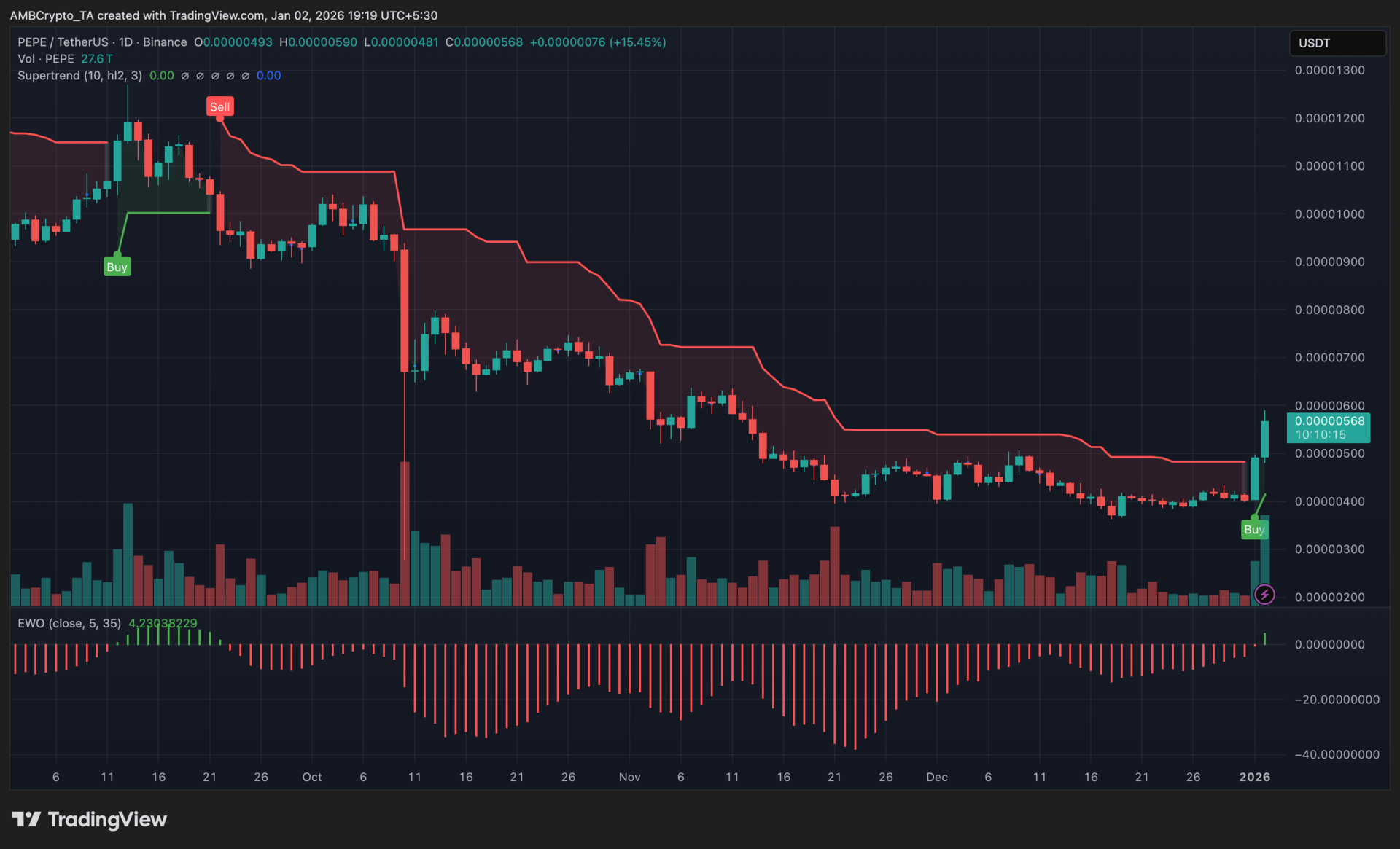 PEPE saw a decisive upside move after spending several sessions consolidating within a tight range. The latest daily candle closed firmly above the Supertrend, marking the first bullish trend signal since the broader downtrend began. This shift suggested that bearish control weakened meaningfully, allowing momentum to rotate in favor of buyers.