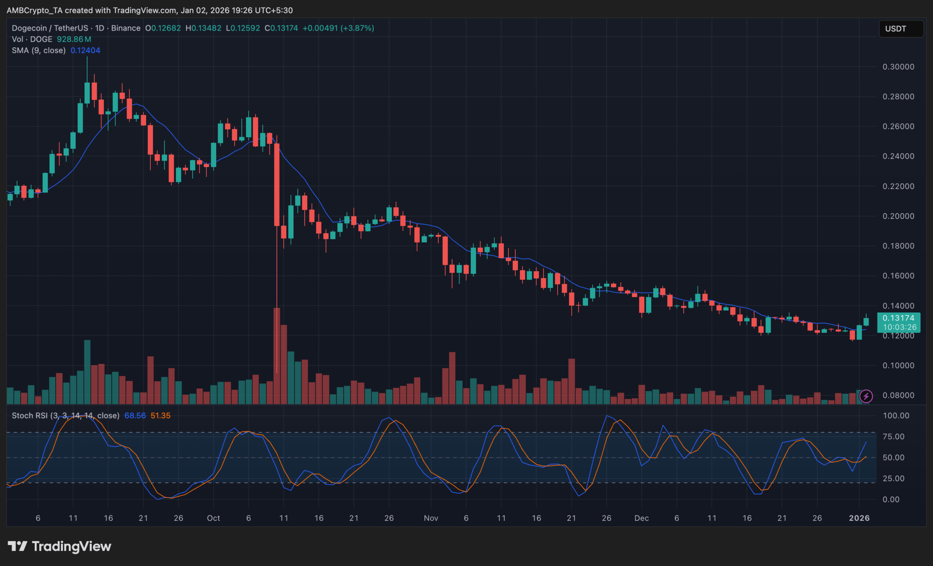 Recent daily candles reflected a tentative shift, with DOGE closing back above its 9-day SMA, a level that had previously acted as short-term resistance.