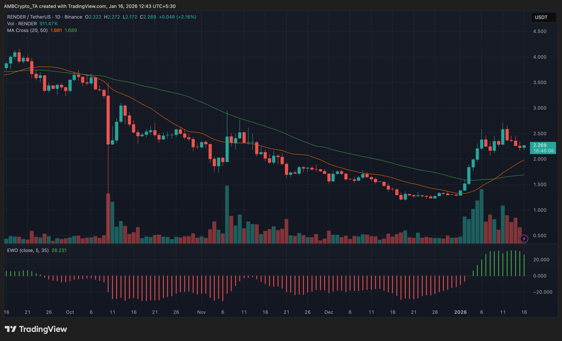 RENDER traded near $2.26 at press time, posting modest gains over the last 24 hours after a strong multi-week rally.