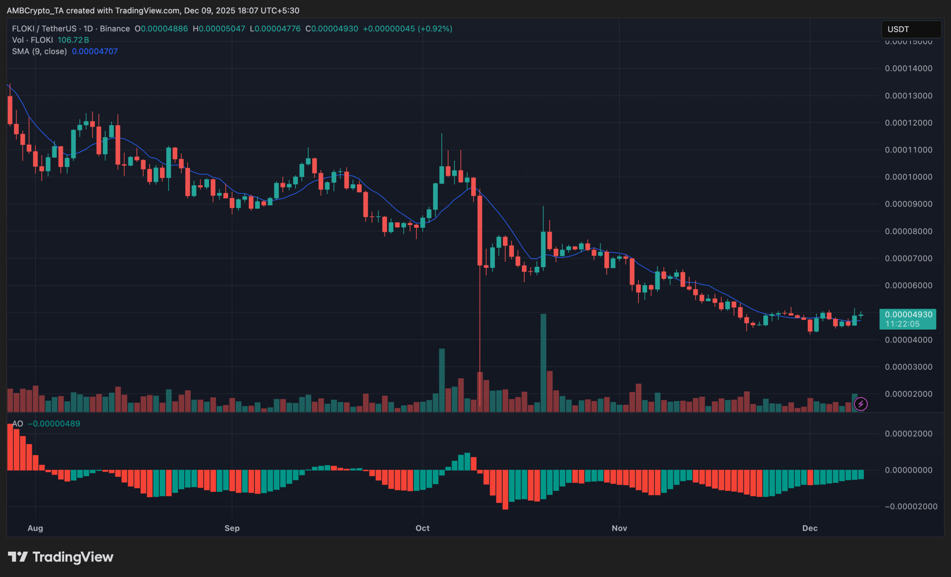FLOKI’s price held its recent recovery path as the latest candle closed above the 9-day SMA, reinforcing short-term buyer strength after a prolonged downtrend. The Awesome Oscillator continued printing green bars, showing steadier bullish momentum building through December, though not yet signaling a strong trend reversal. Volume remained moderate but supported the slow grind higher, indicating consistent participation rather than aggressive accumulation. A nearby resistance level sits around $0.000050, while $0.000046 serves as immediate support if momentum weakens. On the catalyst front, FLOKI’s recent visibility increased after the launch of its first regulated ETP in Europe, a development that may have supported sentiment around the token despite broader market stagnation. For now, traders should watch whether FLOKI can maintain closes above the SMA and sustain green AO bars, as these conditions present the clearest signs of a potential shift away from its multi-month drift.