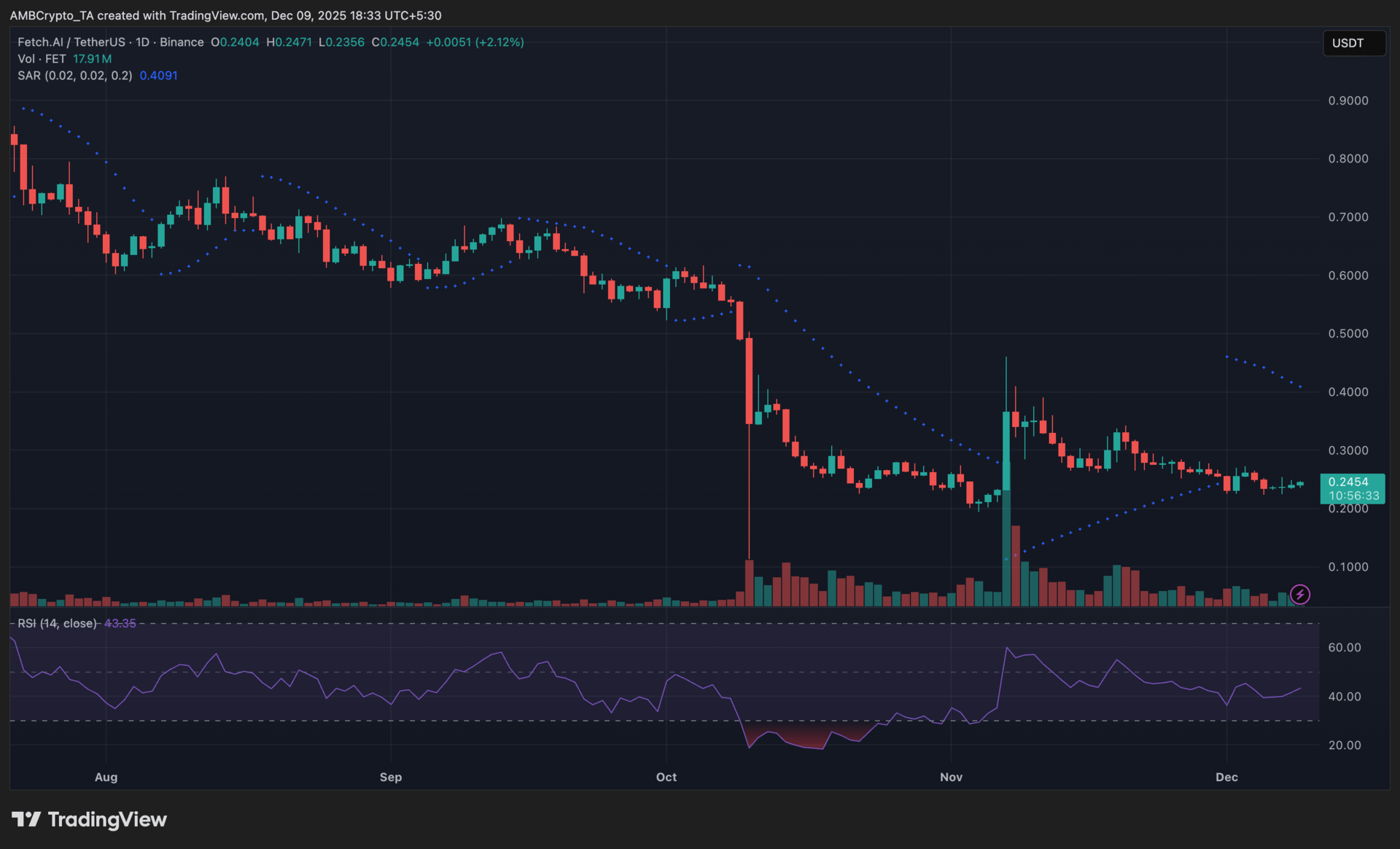FET traded near $0.24 after a modest daily gain, with price movement staying capped under overhead SAR levels in December.