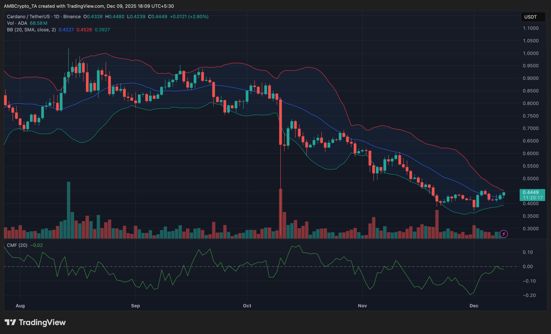 ADA was last seen near $0.44 after a mild intraday climb, closing just above the Bollinger mid-band for the first time in several sessions.
