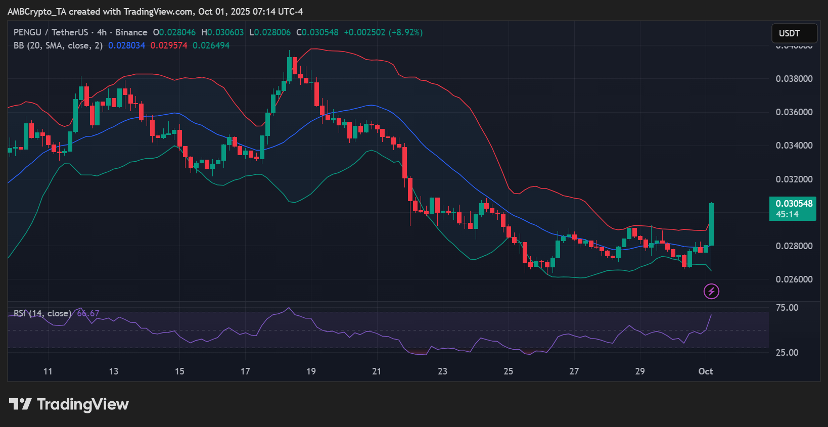 On the 4-hour chart, though, PENGU looks overbought. Though the memecoin gained today, it was after a steady fall over the last two weeks - not much home to write home about, in the long run. The memecoin is firmly in overbought territory right now, with its RSI and Bollinger Bands both flashing "sell" signals.