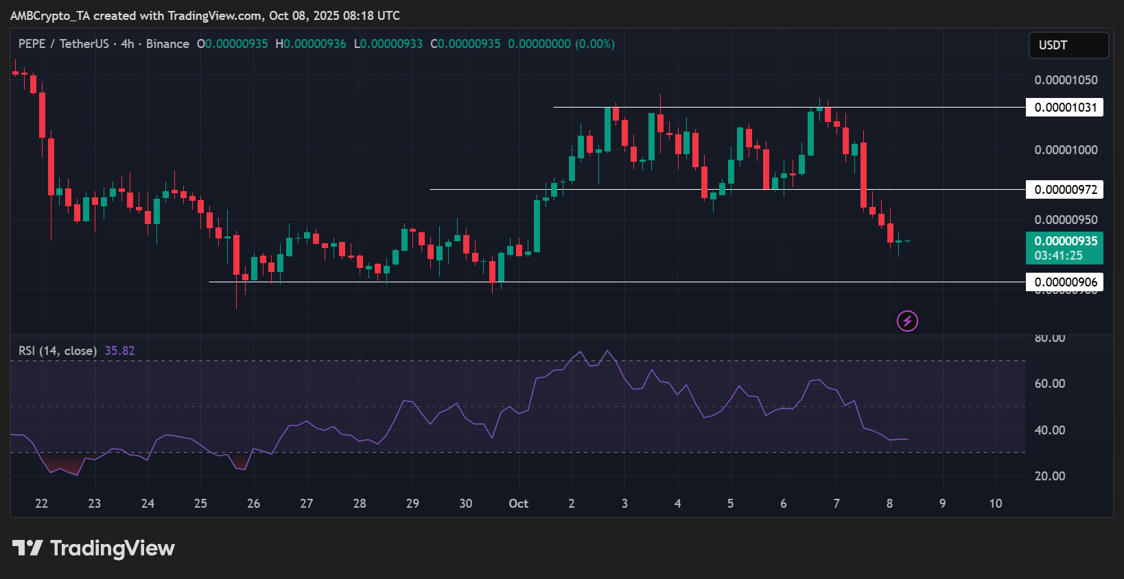 However, if PEPE continues to fall, it could retest its previous support level of $0.00906. A failure to maintain this level could result in short-term consolidation.