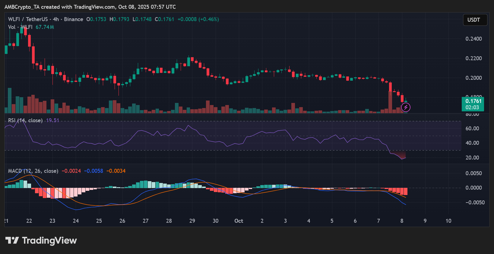 On the charts, WLFI's RSI was at a troubling 20 while its MACD continued in a freefall, showing the sellers are in no mood to stop.