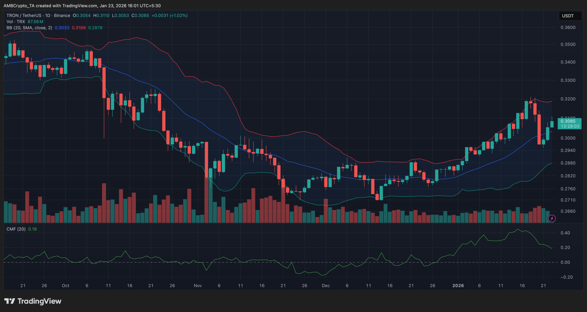 TRX continued to build on its recent advance, trading close to $0.308 after bouncing from the $0.295–$0.298 zone earlier this week. Bollinger Bands widened during the move, reflecting rising volatility as price briefly approached the upper band near $0.318 before easing. Volume picked up during the push higher, suggesting the move was supported by active participation rather than short-lived spikes.