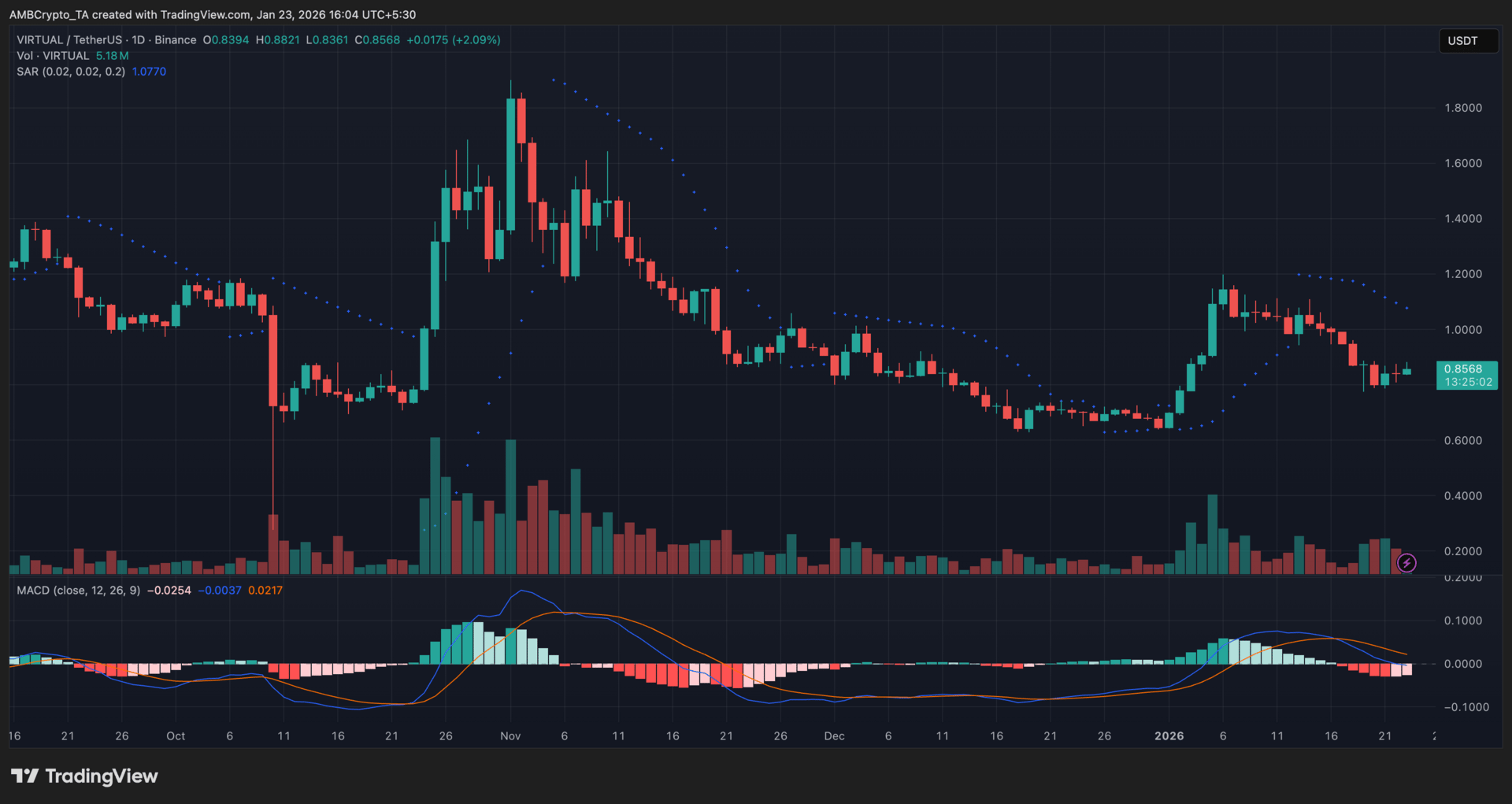 Virtuals Protocol attempted a short-term rebound after price held above the $0.83–$0.84 zone, a level that had previously acted as a base during December’s decline. While the bounce pushed VIRTUAL slightly higher, Parabolic SAR dots remained above the candles, signaling that the broader trend stayed bearish despite the recovery attempt.